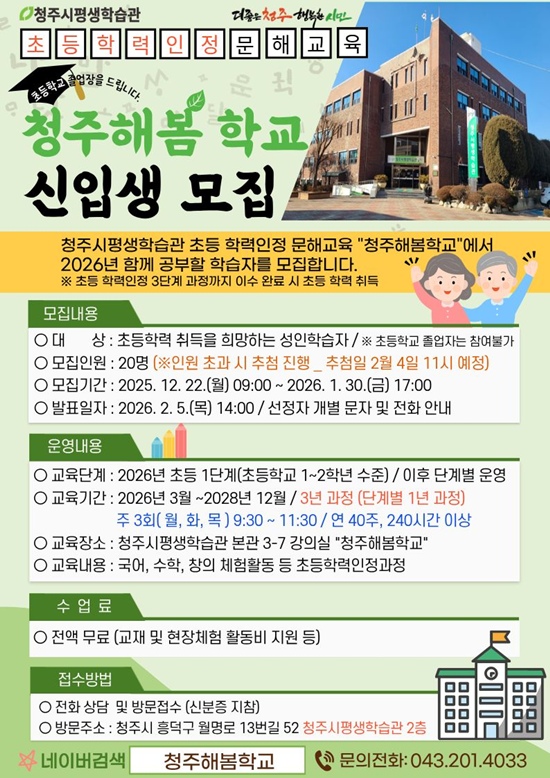 (청주=국제뉴스) 이인영 기자 = 충북 청주시평생학습관은 초등학력 취득을 희망하는 성인 학습자를 위한 학력 인정 문해교육 프로그램 '청주해봄학교' 2026학년도 신입생을 모집한다고 20일 밝혔다.