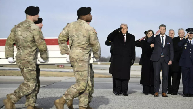 도널드 트럼프 미국 대통령과 피트 헤그세스 국방부 장관을 비롯한 미 정부 고위 관계자들이 19일(현지시간) 시리아에서 사망한 미국인 3명의 유해 송환을 기리는 행사에 참석했다.(사진=AFP) |