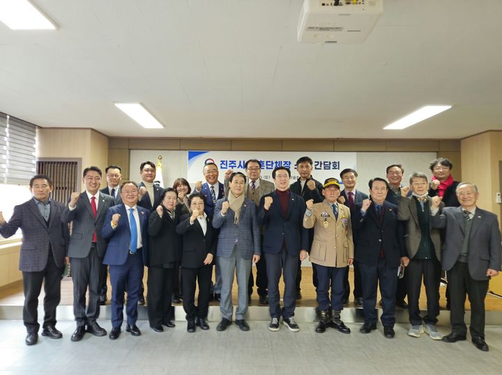 [서울=뉴시스] 황준선 기자 = 권오을 국가보훈부 장관이 20일 오후 경남 진주시 보훈회관에서 광복회와 상이군경회 등 경남지역 9개 보훈단체장들과 현장 소통 간담회를 갖고 기념촬영 하고 있다. (사진=국가보훈부 제공) 2025.12.20. photo@newsis.com *재판매 및 DB 금지