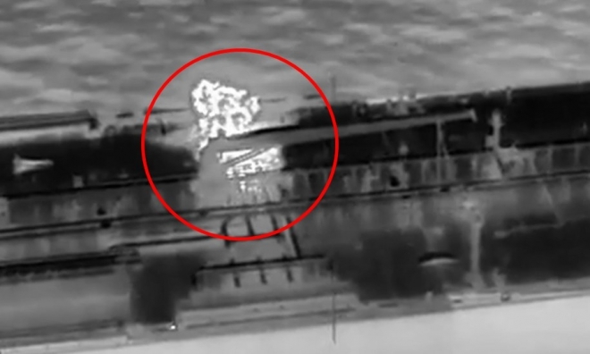 우크라이나군이 지중해 중립 해역에서 드론으로 러시아의 그림자 함대 유조선을 공격하는 모습. 영상 캡처 |