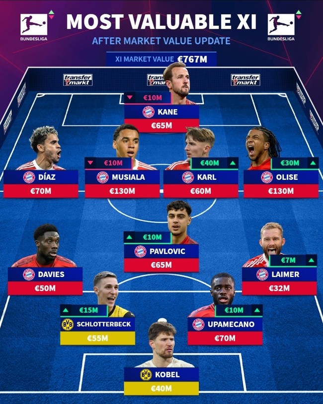 축구 통계 매체 '트랜스퍼마크트'는 19일(한국시간) 독일 분데스리가 선수들의 시장 가치를 업데이트하며 시장 가치 베스트 11을 내놨다.