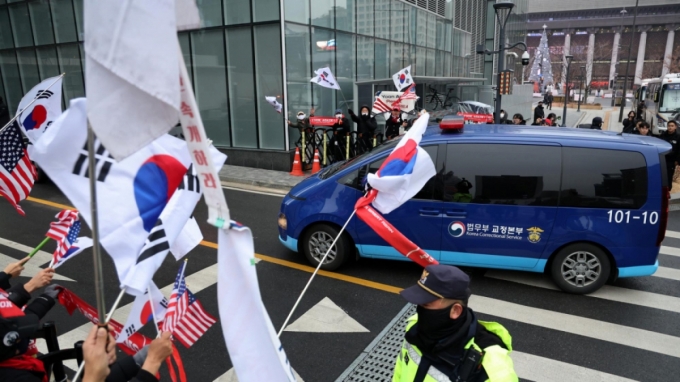윤석열 전 대통령을 태운 호송차가 20일 김건희 특검 사무실이 있는 서울 종로구 KT광화문 웨스트 빌딩으로 들어서고 있다./사진=뉴시스. |