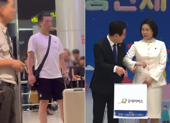 14일 베트남에서 부산으로 향하는 비행기에서 베트남 여성을 성희롱한 혐의로 공안에 끌려간 한국 남성(왼쪽·SNS 캡처). 16일 용산 대통령실에서 열린 ‘2025 기부·나눔단체 초청행사’에서 이재명 대통령이 실수하자 김혜경 여사가 옆구리를 슬쩍 찌르고 있다. [유튜브 ‘KTV 이매진’ 영상 캡처]