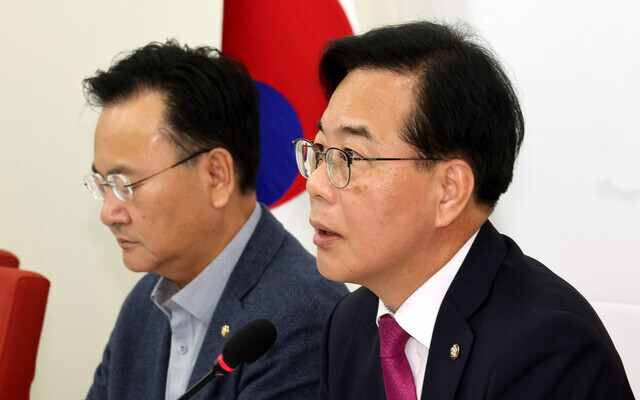 송언석 국민의힘 원내대표가 지난 14일 국회에서 기자간담회를 하고 있다. 김경호 선임기자 jijae@hani.co.kr |