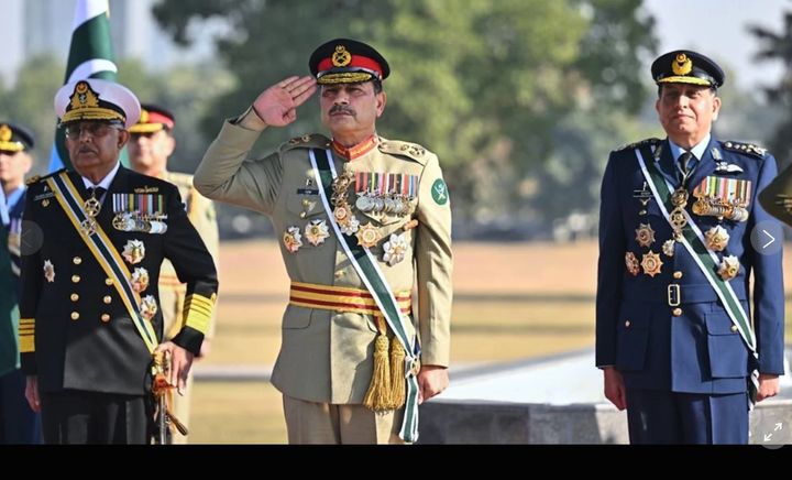 [이슬라마바드=AP/뉴시스] 파키스탄의 육해공군 참모총장이 8일 라왈핀디 합동군사령부에서 열린 의장대 사열식에서 참석하고 있다. 왼쪽부터 나비드 아슈라프 해군, 아심 무니르 육군, 아흐메드 바바르 공군참모총장. 사진은 합동참모본부 공보실이 공개했다.2025.12.20. *재판매 및 DB 금지 |