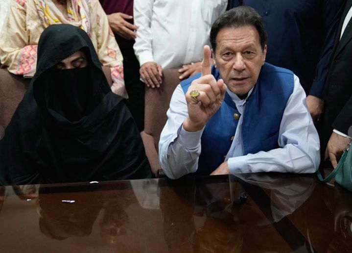 [이슬라마바드=AP/뉴시스] 임란 칸 전 파키스탄 총리와 부인 부슈라 비비가 2023년 7월 17일 파키스탄 라호르 고등법원 사무실에서 여러 사건에 대한 보석금을 제출하기 위한 서류에 서명하기 전 언론에 이야기하고 있다.2025.12.21. *재판매 및 DB 금지 |