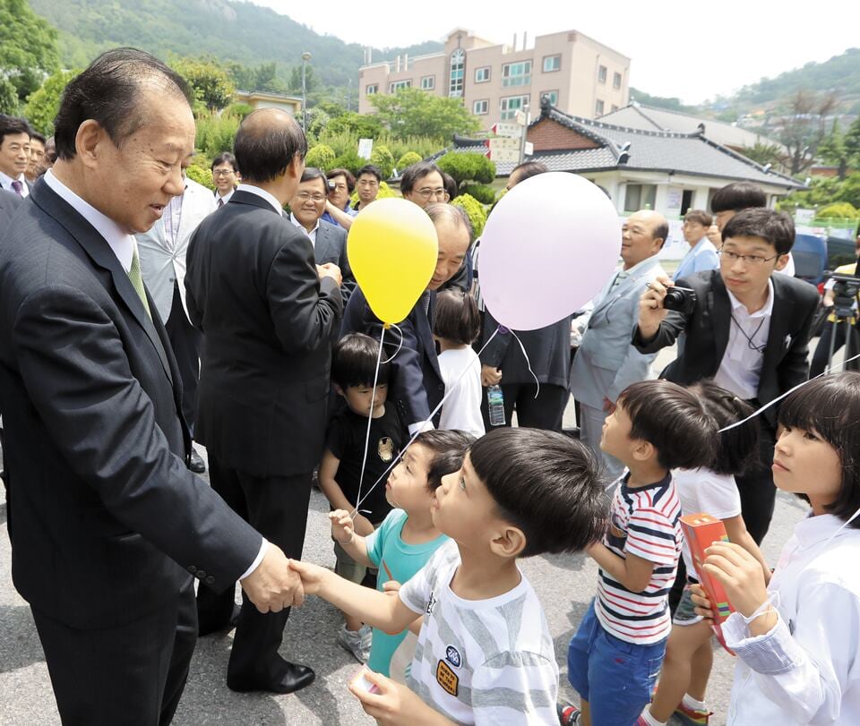 니카이 도시히로 자민당 간사장이 2017년 6월 전남 목포 공생원을 찾아 원생을 만나고 있다. 공생원은 일본 출신의 윤학자 여사가 한국 고아들을 돌봐왔던 곳이다. 유명환 전 외교부 장관은 회고록에서 지난해 은퇴한 니카이 전 의원이 2007년 일본이 여수 엑스포를 지지하는데 큰 역할을 했다고 밝혔다./연합뉴스