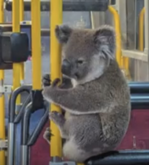 일생의 대부분 시간을 나무에 매달려 살아가는 코알라는 버스 봉에 매달리고 나서야 안심한 듯, 편안한 표정을 지었습니다.