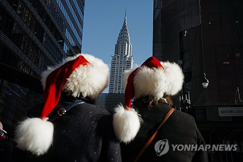산타 모자를 쓰고 뉴욕 시내를 걷는 시민들 |