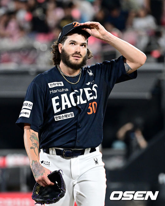 [OSEN=수원, 최규한 기자] 18일 수원 KT위즈파크에서 ‘2025 신한 SOL Bank KBO리그’ KT 위즈와 한화 이글스의 경기가 열렸다.홈팀 KT는 오원석, 방문팀 한화는 코디 폰세를 선발로 내세웠다.6회말 2사 1, 2루 상황 KT 로하스를 내야 파울 뜬공으로 이끌며 실점없이 이닝을 막아낸 한화 선발 폰세가 더그아웃으로 향하고 있다. 2025.07.18 / dreamer@osen.co.kr |