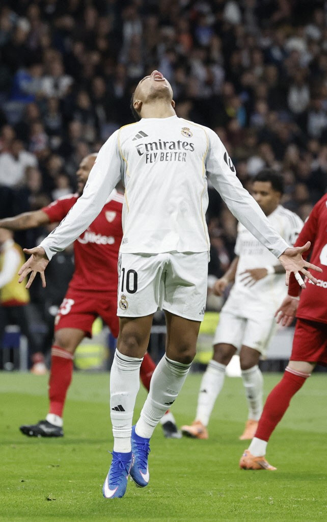 경기 초반부터 음바페는 적극적인 공격 의지를 보였다. 최전방 스트라이커로 출전한 그는 전반부터 여러 차례 득점 기회를 만들어냈다. 하지만 세비야 골키퍼의 연속 선방에 막혀 아쉬움을 달래야 했다. 전반 38분 주드 벨링엄의 헤더 골로 레알 마드리드가 선제골을 터트린 후에도 음바페의 골 사냥은 계속됐다.