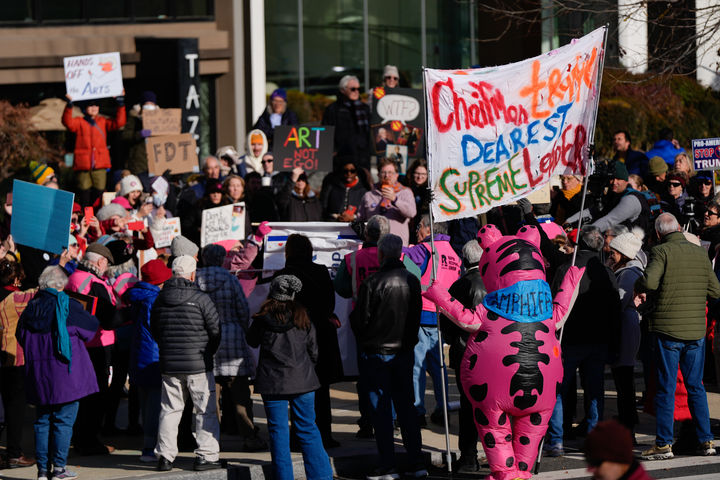 [워싱턴=AP/뉴시스] 20일(현지 시간) 미국 워싱턴 존 F. 케네디 공연예술 센터 앞에서 시위대가 도널드 트럼프 대통령의 이름을 케네디 센터에 추가한 것에 항의하는 시위를 벌이고 있다. 앞서 트럼프 대통령이 임명한 센터 이사회는 케네디 센터 명칭을 '도널드 J. 트럼프-존 F. 케네디 공연예술 센터'로 변경했다. 2025.12.21.