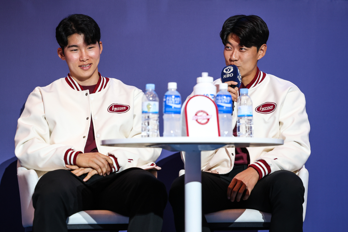 송성문(오른쪽)이 김혜성과 함께 2024시즌 KBO리그 개막 미디어데이에 참석해 질문에 답하고 있다. 사진=키움히어로즈 제공 |