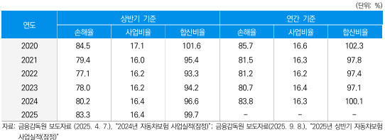 22일 보험연구원 천지연 연구위원이 작성한 ‘2025년 자동차보험 손해율 분석 및 진단’ 리포트에 따르면 올해 3분기말 자동차보험 손해율은 전년동기대비 4.5%포인트 상승한 85.8%를 기록했다. 연말이 될수록 차 사고 증가 등 손해율 상승 요인이 많아지는 점을 고려할 때 올해 연간 손해율은 3분기말보다 더 높아질 전망이다.
