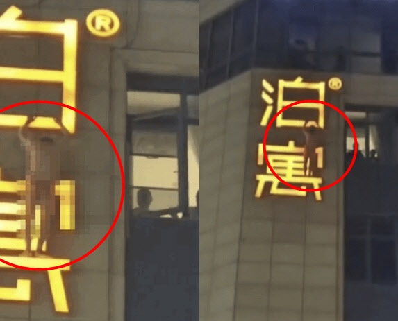 영상 속 빨간색 속옷만 입은 남성 A씨는 한 호텔 건물 4층 외벽 간판에 위태롭게 매달려 있었다. 간판을 두 손으로 꽉 잡은 그는 아래쪽 간판 글자에 발끝을 겨우 걸친 채 필사적으로 버티고 있다.