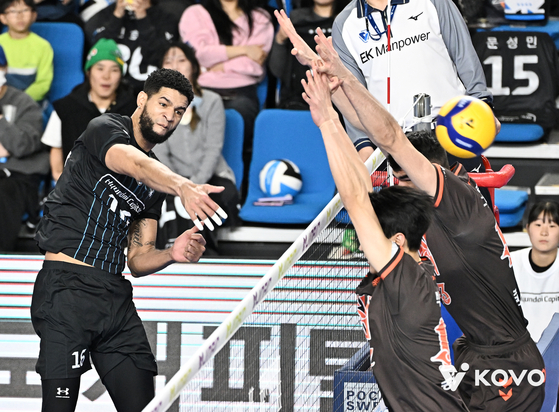 현대캐피탈 아웃사이드 히터 레오(왼쪽)가 강력한 스파이크로 OK저축은행 블로킹 벽을 뚫어내고 있다. [사진 KOVO] |