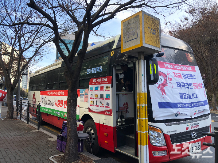 성탄절을 앞두고 경기도 용인시 새에덴교회 앞에 헌혈차가 멈춰 섰다. 연말연시 유독 줄어드는 혈액 수급을 돕기 위해 교회 성도들이 팔을 걷어붙였다.