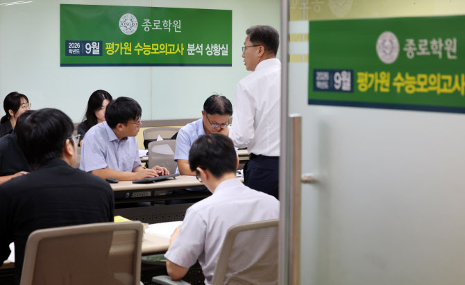 2026학년도 대학수학능력시험 9월 모의평가가 실시된 3일 서울 양천구 종로학원 본사에서 임성호 대표와 강사들이 모의고사에 출제된 문제를 분석하고 있다.(사진=연합뉴스) |