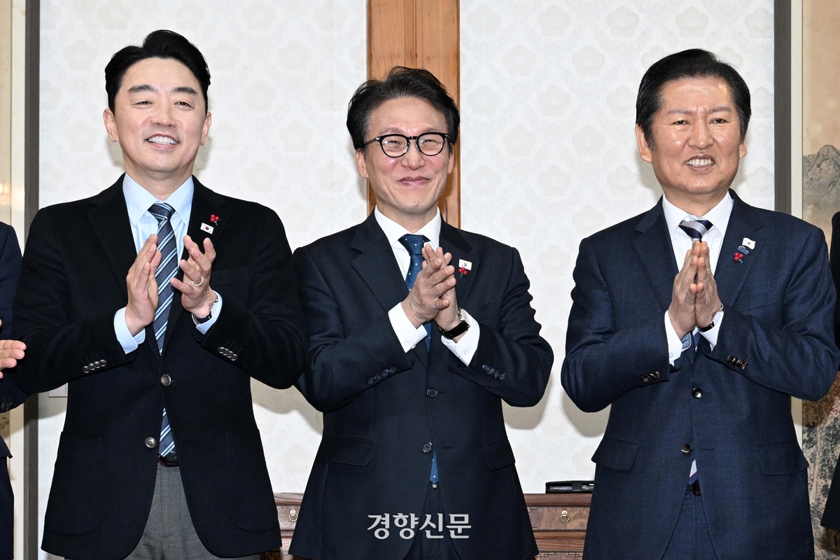 김민석 국무총리(가운데), 정청래 더불어민주당 대표(사진 오를쪽), 강훈식 대통령실 비서실장이 21일 서울 종로구 국무총리공관에서 열린 제5차 고위당정협의회에 앞서 참석자들과 기념 촬영을 하고 있다. 이날 고위당정협의회에서는 부동산 대책, 대전·충남 통합 현안, 기업회생절차에 들어간 홈플러스 정상화 방안 등이 논의됐다. 정효진 기자 |