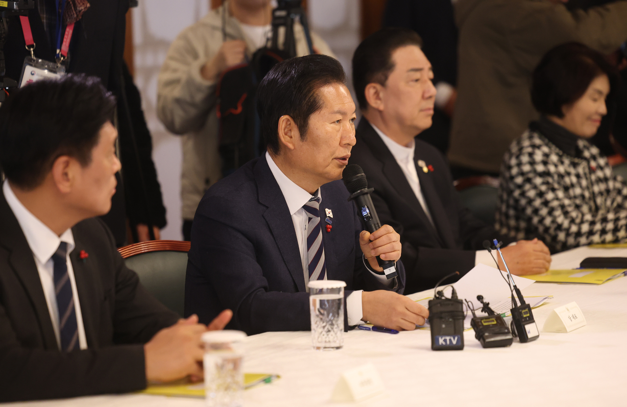 정청래 (왼쪽에서 두번째) 더불어민주당 대표가 21일 서울 종로구 총리공관에서 열린 고위당정협의회에서 발언하고 있다. [연합] |