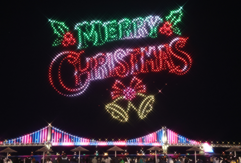 21일 부산 수영구 광안리해수욕장 일원에서 ‘미리 메리크리스마스’를 주제로 한 ‘광안리 M 드론라이트쇼’ 특별공연이 펼쳐지고 있다.