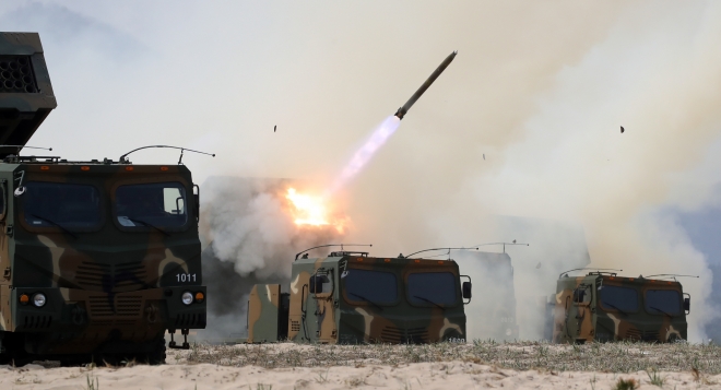 강원도 고성군 송지호 해변에서 열린 지·해 합동해상사격훈련에서 다연장로켓 ‘천무’가 발사되고 있다. 연합뉴스. |