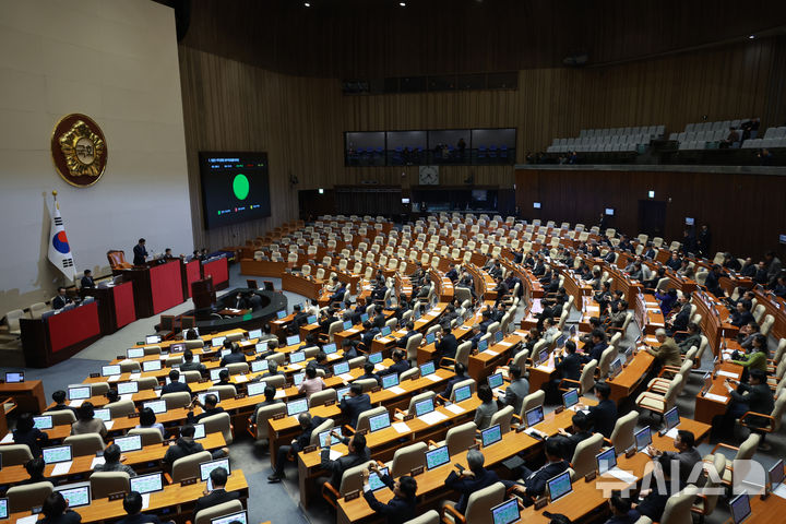 [서울=뉴시스] 고승민 기자 = 14일 서울 여의도 국회에서 열린 본회의에서 경찰관 직무집행법 일부개정안이 국민의힘 의원 불참 속 가결되고 있다. 2025.12.14. kkssmm99@newsis.com |