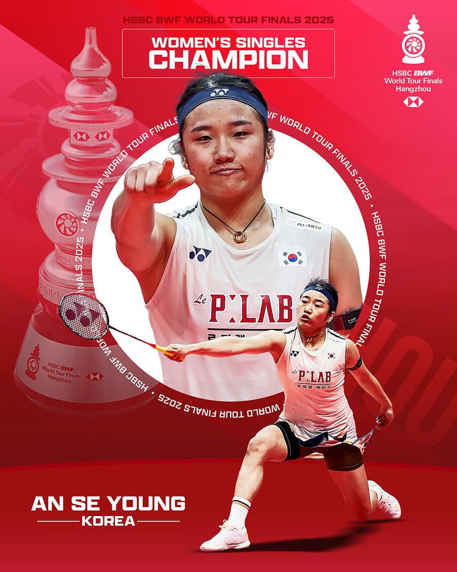 안세영은 21일 중국 항저우의 올림픽스포츠센터에서 열린 세계배드민턴연맹(BWF) 월드투어 파이널스 2025 여자 단식 결승에서 세계 2위 왕즈이를 2-1(21-13 18-21 21-10)로 꺾고 정상에 올랐다.