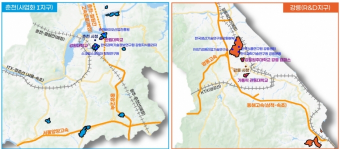 기존 광역 연구개발특구는 대덕·광주·대구·부산·전북 등 5개로, 10년 만의 신규 지정이다. △바이오 신소재(춘천) △디지털 헬스케어(원주) △반도체(센서) 소재·부품(강릉) 등 3대 특화산업을 중심으로 집중 육성할 예정이다.