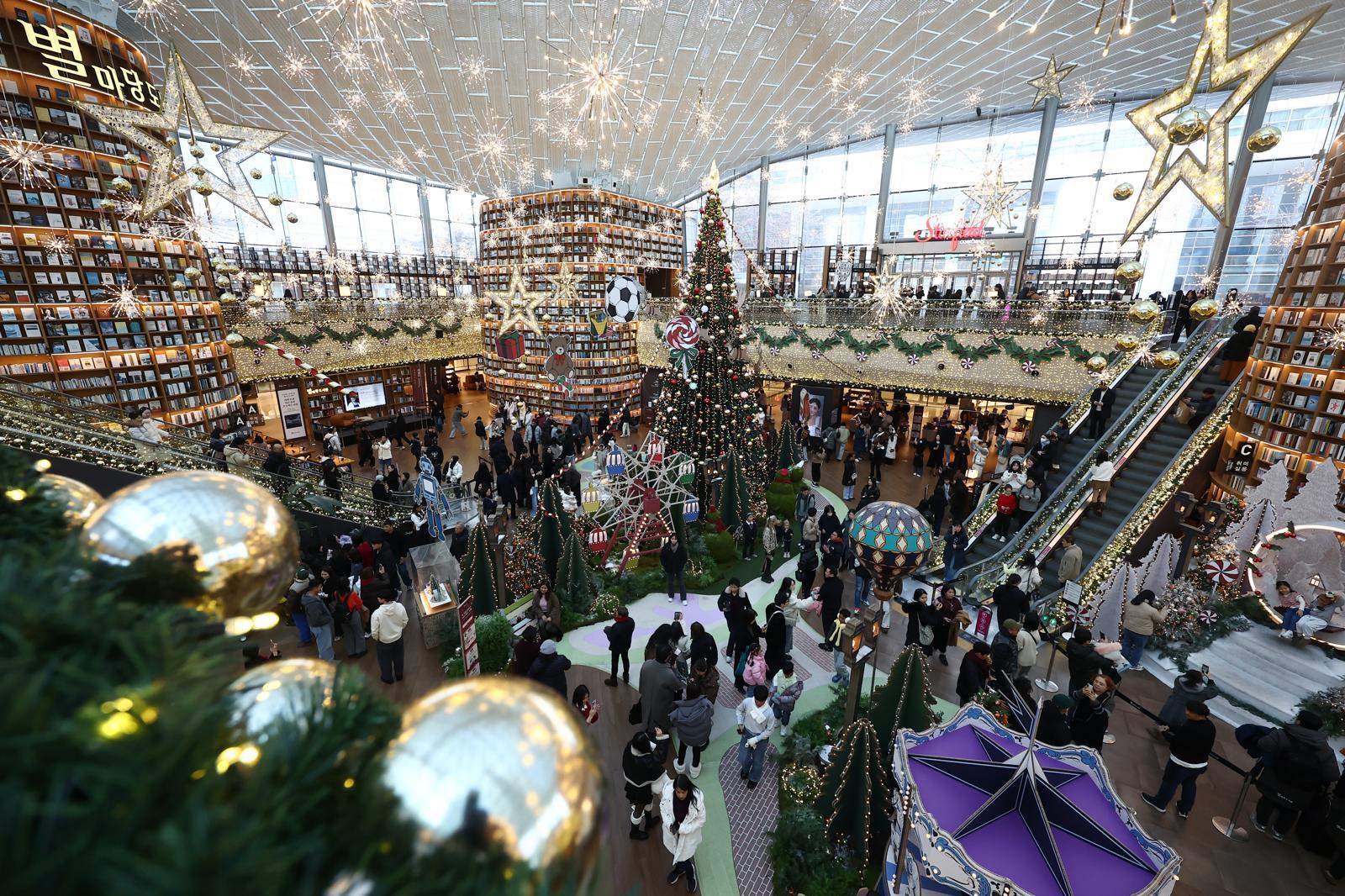 크리스마스를 앞둔 21일 서울 강남구 코엑스 별마당도서관에서 시민들이 대형 크리스마스트리를 배경으로 사진을 찍고 있다. 스타필드 별마당도서관 운영사인 신세계프라퍼티는 올해 크리스마스 캠페인 시작 한 달 만에 누적 1000만 명이 스타필드(하남, 고양, 안성, 수원, 코엑스몰) 크리스마스 공간에 방문했다고 밝혔다.