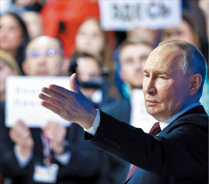‘국민이 무엇을 필요로 하는지 어떻게 파악하느냐’는 질문에 푸틴은 모스크바 시내를 ‘암행 순찰’한다고 답했다. “정부와 여론조사 기관 자료를 정기적으로 보고받지만 민생 최전선에 있는 국민과 직접 이야기한다”며 “때때로 모스크바를 돌아다니며 상황을 직접 파악하고 국민의 정서를 느낀다”고 했다. ‘결혼하고 싶어요’라는 팻말을 들고 있던 남성 기자가 생중계 현장에서 여자 친구에게 청혼하자 청중들은 박수쳤다. 푸틴은 “남자가 가장이 돼야 한다. 축의금을 거둬야겠다”며 ‘덕담’했다. 이어 “자녀를 많이 갖는 것이 유행이 돼야 한다”며 한국의 출산율(0.7%)을 언급했다.