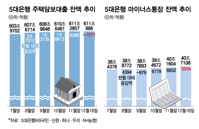 연말 '대출절벽' 현상이 심화하면서 이달 주요 은행의 주택담보대출(이하 주담대) 잔액이 1년9개월 만에 감소할 가능성이 커졌다. 주담대가 막히자 차주들은 미리 개설해둔 마이너스통장을 활용, 급전을 마련하고 있다. 금융당국은 당분간 가계대출 관리강화 기조를 유지할 방침이다.