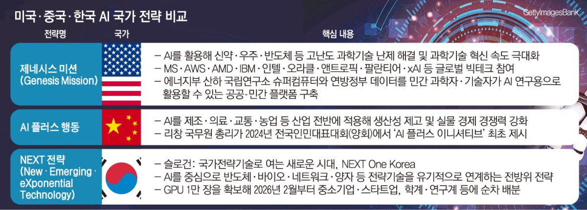 미국은 인공지능(AI)을 통해 과학기술 분야의 ‘난제’를 돌파하겠다고 선언했고, 중국은 AI를 산업 현장에 투입해 생산 체계를 재편하고 있다. ‘AI 2강’이 각기 다른 방식으로 국가 주도 경쟁에 속도를 내는 가운데, 한국도 이에 대응하는 전방위 AI 정책 패키지를 내놨다. AI 패권 경쟁이 기술 차원을 넘어 국가 전략의 영역으로 확장되는 상황에서 한국의 선택이 실질적인 경쟁력으로 이어질 수 있을지가 관건이다.