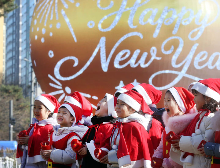 [서울=뉴시스] 산타 복장을 차려입은 송파구청 어린이집 아이들이 18일 서울 송파구 석촌호수 더 스피어에서 크리스마스 캐럴을 부르고 있다. (사진=송파구 제공) 2025.12.18. photo@newsis.com *재판매 및 DB 금지
