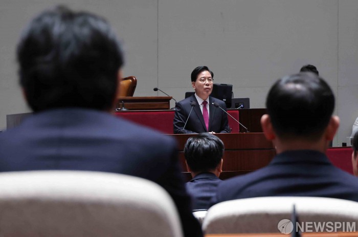 [서울=뉴스핌] 윤창빈 기자 = 송언석 국민의힘 원내대표가 22일 서울 여의도 국회에서 열린 의원총회에서 모두발언을 하고 있다. 2025.12.22 pangbin@newspim.com