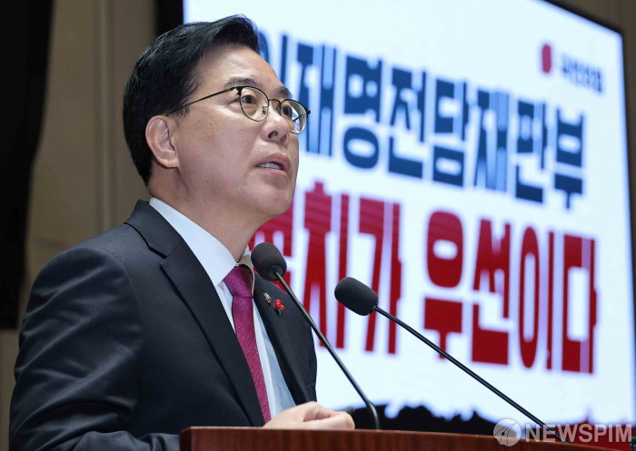 [서울=뉴스핌] 윤창빈 기자 = 송언석 국민의힘 원내대표가 22일 서울 여의도 국회에서 열린 의원총회에서 모두발언을 하고 있다. 2025.12.22 pangbin@newspim.com