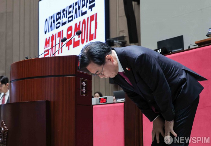 [서울=뉴스핌] 윤창빈 기자 = 송언석 국민의힘 원내대표가 22일 서울 여의도 국회에서 열린 의원총회에서 모두발언을 하기 전 인사하고 있다. 2025.12.22 pangbin@newspim.com |