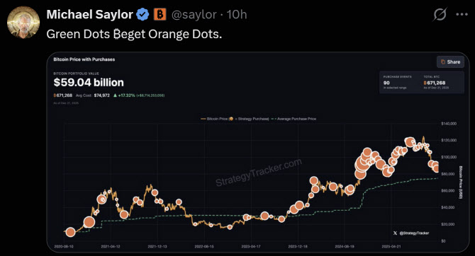 마이클 세일러 스트래티지(Strategy) 공동 창업자 겸 회장이 21일 “녹색 점들이 주황색 점들을 만들어낸다(Green Dots Beget Orange Dots)”는 글을 올려 매수를 암시했다. 위의 그래프는 67만1268개의 비트코인을 보유하고 있는 스트래티지의 연도별 비트코인 매수 그래프이다. (사진=세일러 회장 X) |
