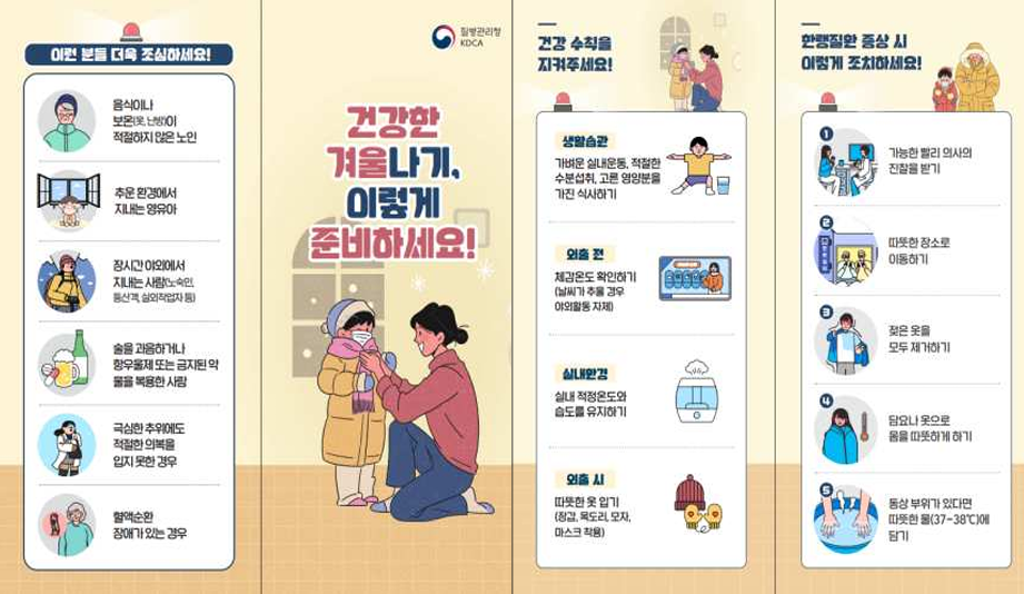 질병청은 “초겨울처럼 갑작스러운 추위에는 인체가 온도 변화에 적응하기 어려워 한랭질환 위험이 커진다”며 “고령자와 만성질환자는 급격한 온도 변화로 증상이 악화할 수 있어 날씨가 춥다면 실외활동을 자제해야 한다”고 당부했다. 그러면서 “특히 한파 특보 발령 시 외출 등 야외활동 자제가 필요하다”고 했다.