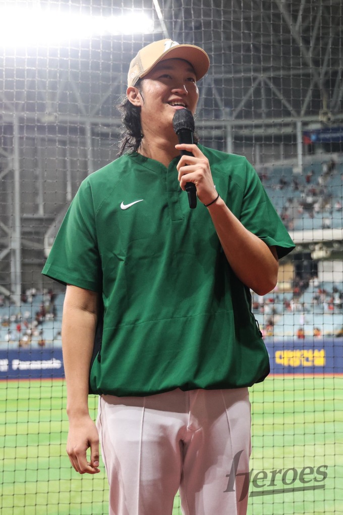 키움 안우진이 전역 후 복귀해 홈팬들에게 인사하고 있다. [사진=키움 히어로즈] 이웅희 기자= 2025.12.22 iaspire@newspim.com |