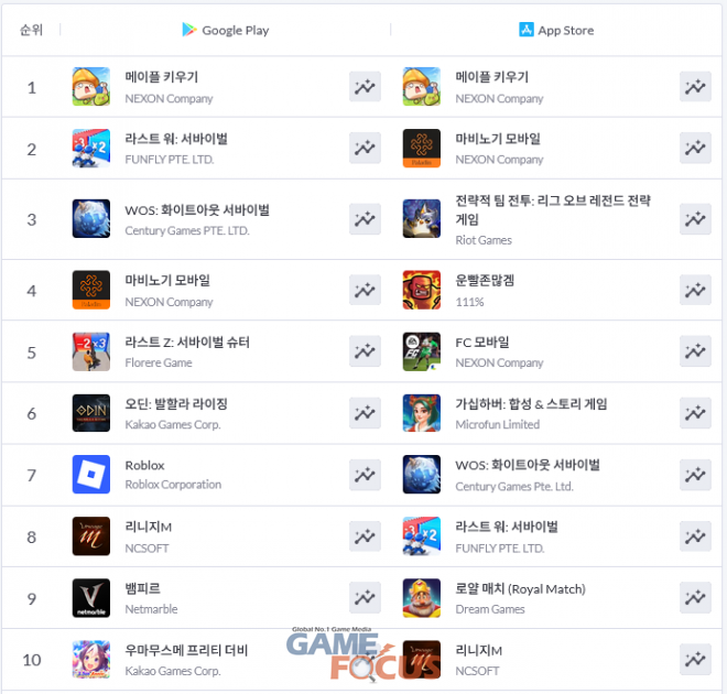 애플 앱스토어에서는 넥슨의 '메이플 키우기'와 '마비노기 모바일'이 투톱을 달리고 있다. 여기에 '전략적 팀 전투', '운빨존많겜', 'FC모바일'이 TOP 5를 형성하고 있다. 넥슨의 게임은 TOP 5 내 3종이 이름을 올리면서 모바일게임 시장에서도 선전하고 있다.