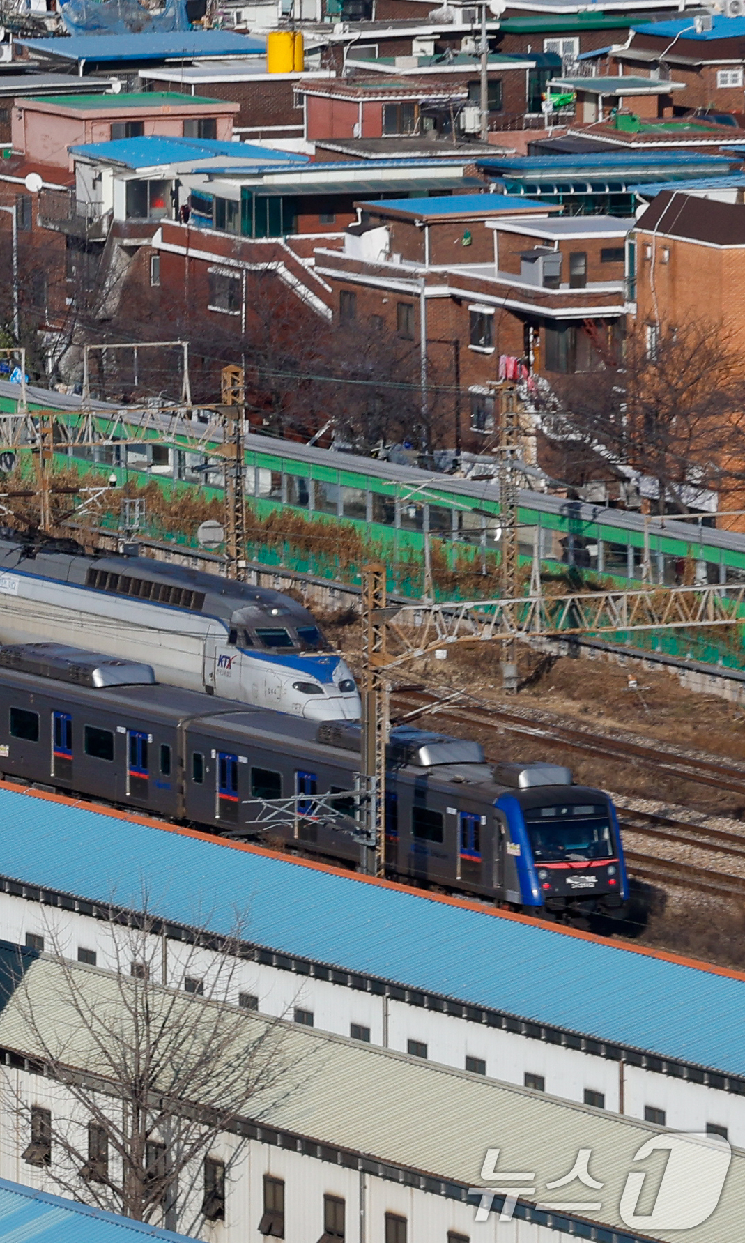 (서울=뉴스1) 안은나 기자 = 성과급 정상화를 요구하는 전국철도노동조합(철도노조)의 총파업을 하루 앞둔 22일 서울 구로구 한국철도공사 구로차량사업소 인근에 열차가 이동하고 있다. 한국철도공사(코레일)는 수도권전철(서울지하철 1·3·4호선, 수인분당선, 경의중앙선, 경강선 등)과 대구·경북권 대경선(구미~경산), 부산·경남권 동해선(부전~태화강) 등 광역전철의 경우 평시 대비 25% 감축 운행이 불가피하다고 밝혔다. 2025.12.22/뉴스1