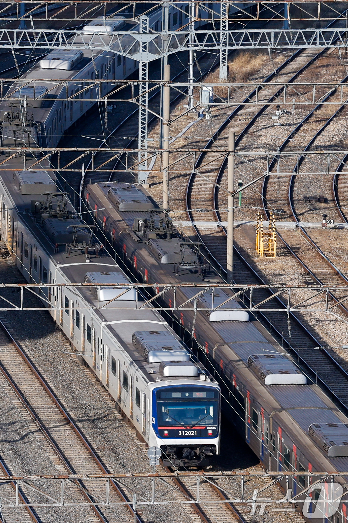 (서울=뉴스1) 안은나 기자 = 성과급 정상화를 요구하는 전국철도노동조합(철도노조)의 총파업을 하루 앞둔 22일 서울 구로구 한국철도공사 구로차량사업소에 열차가 이동하고 있다. 한국철도공사(코레일)는 수도권전철(서울지하철 1·3·4호선, 수인분당선, 경의중앙선, 경강선 등)과 대구·경북권 대경선(구미~경산), 부산·경남권 동해선(부전~태화강) 등 광역전철의 경우 평시 대비 25% 감축 운행이 불가피하다고 밝혔다. 2025.12.22/뉴스1