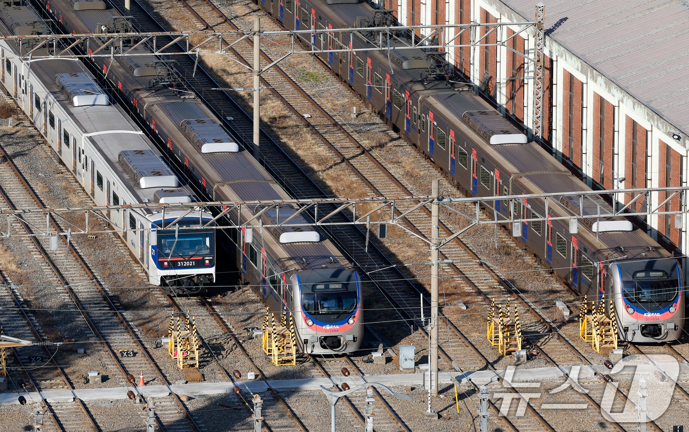 (서울=뉴스1) 안은나 기자 = 성과급 정상화를 요구하는 전국철도노동조합(철도노조)의 총파업을 하루 앞둔 22일 서울 구로구 한국철도공사 구로차량사업소에 열차가 이동하고 있다. 한국철도공사(코레일)는 수도권전철(서울지하철 1·3·4호선, 수인분당선, 경의중앙선, 경강선 등)과 대구·경북권 대경선(구미~경산), 부산·경남권 동해선(부전~태화강) 등 광역전철의 경우 평시 대비 25% 감축 운행이 불가피하다고 밝혔다. 2025.12.22/뉴스1
