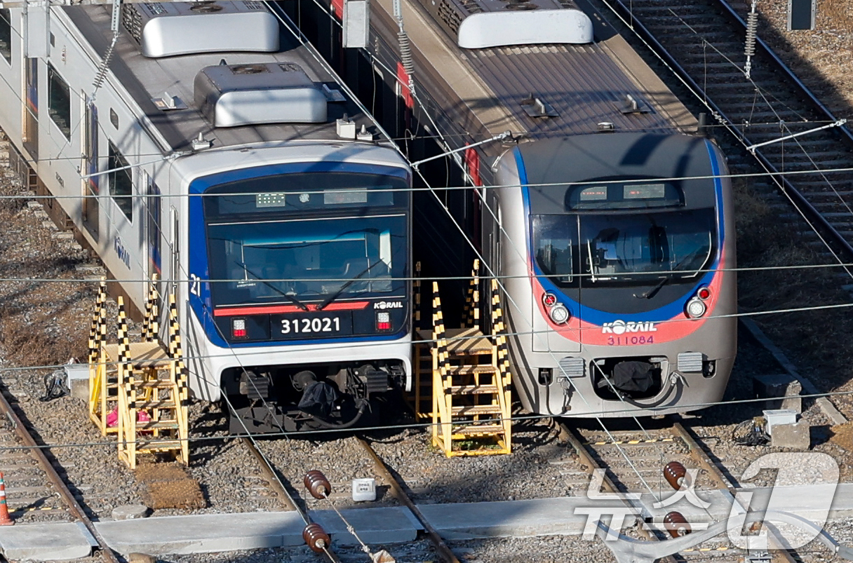 (서울=뉴스1) 안은나 기자 = 성과급 정상화를 요구하는 전국철도노동조합(철도노조)의 총파업을 하루 앞둔 22일 서울 구로구 한국철도공사 구로차량사업소 인근에 열차가 이동하고 있다. 한국철도공사(코레일)는 수도권전철(서울지하철 1·3·4호선, 수인분당선, 경의중앙선, 경강선 등)과 대구·경북권 대경선(구미~경산), 부산·경남권 동해선(부전~태화강) 등 광역전철의 경우 평시 대비 25% 감축 운행이 불가피하다고 밝혔다. 2025.12.22/뉴스1