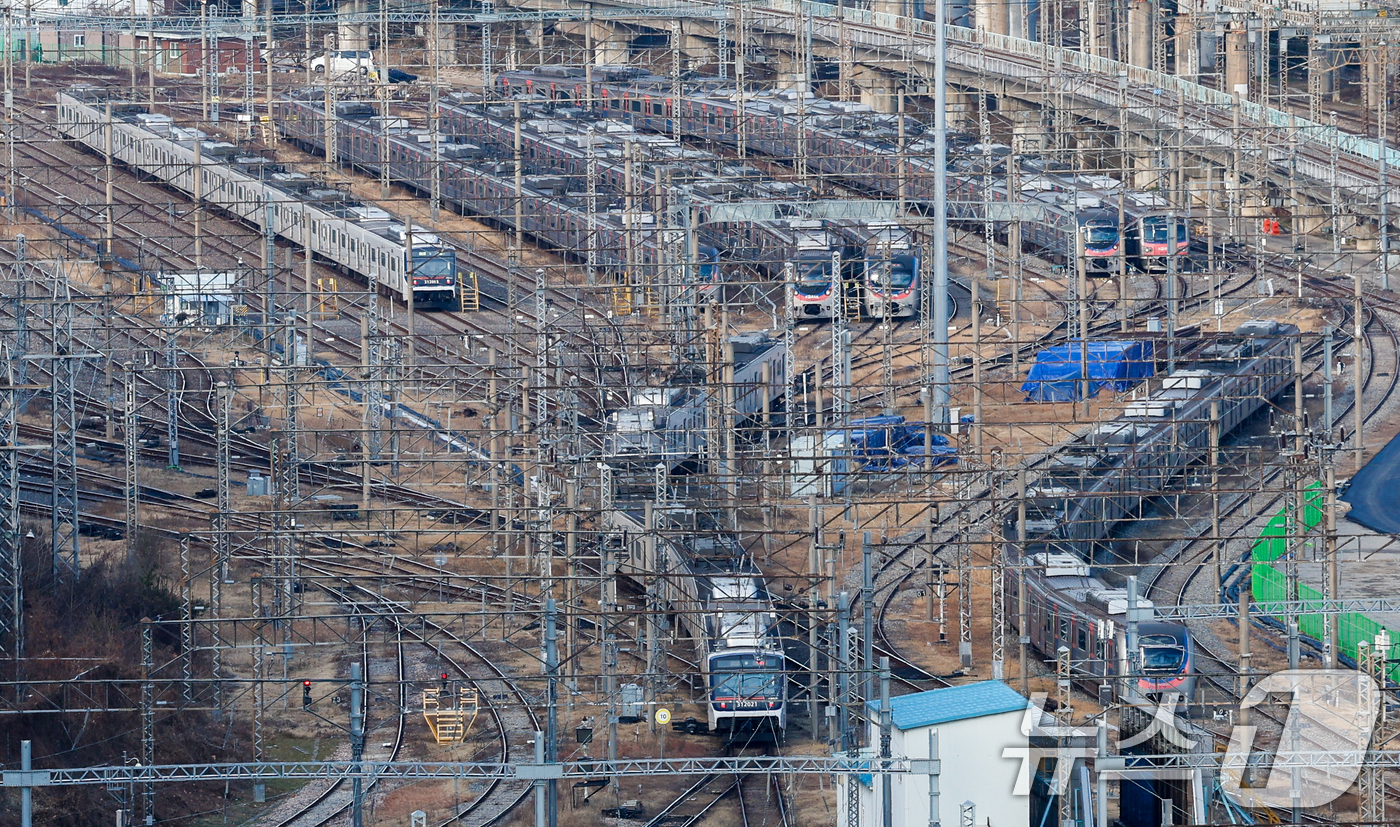 (서울=뉴스1) 안은나 기자 = 성과급 정상화를 요구하는 전국철도노동조합(철도노조)의 총파업을 하루 앞둔 22일 서울 구로구 한국철도공사 구로차량사업소에 열차가 이동하고 있다. 한국철도공사(코레일)는 수도권전철(서울지하철 1·3·4호선, 수인분당선, 경의중앙선, 경강선 등)과 대구·경북권 대경선(구미~경산), 부산·경남권 동해선(부전~태화강) 등 광역전철의 경우 평시 대비 25% 감축 운행이 불가피하다고 밝혔다. 2025.12.22/뉴스1