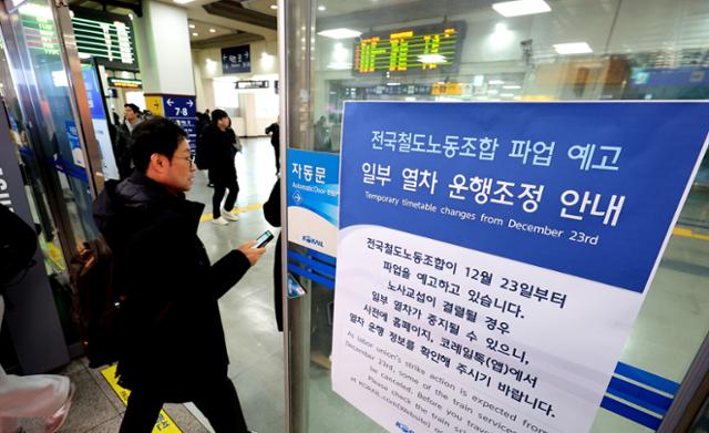 22일 대구 소재 동대구역에 파업 예고에 따른 열차 운행조정 안내문이 붙어 있다. 철도노조는 23일 오전 9시부터 '성과급 정상화'를 요구하는 총파업에 돌입한다고 예고했다. 뉴시스 |