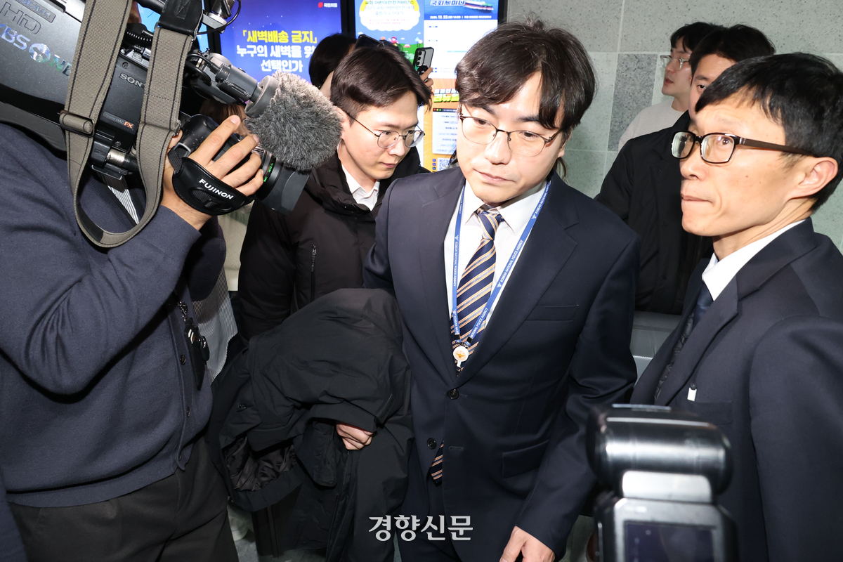 경찰청 국가수사본부 특별전담수사팀장인 박창환 중대범죄수사과장(가운데)이 지난 15일 통일교 금품 수수 의혹을 받는 전재수 전 해양수산부 장관의 국회의원회관 사무실 압수수색을 마친 뒤 빠져나오고 있다. 한수빈 기자 |