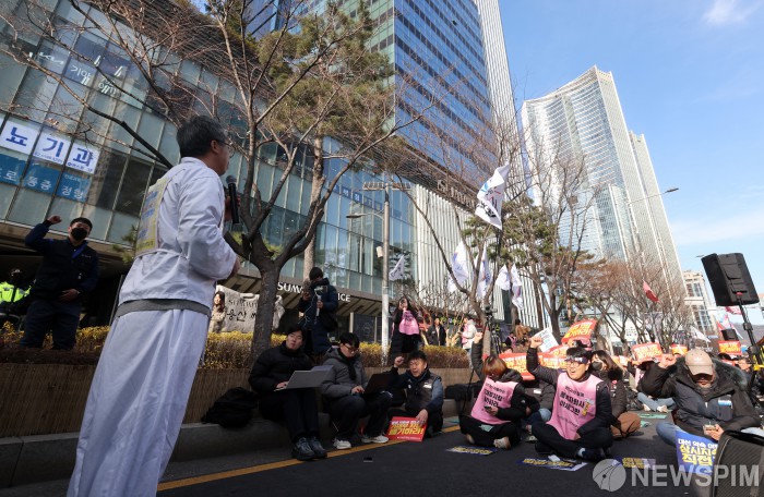 [서울=뉴스핌] 최지환 기자 = 22일 오후 서울 용산구 코레일네트웍스 사무실 앞에서 철도노조 소속 조합원들이 코레일네트웍스지부 총파업 결의대회를 열고 있다. 2025.12.22 choipix16@newspim.com |