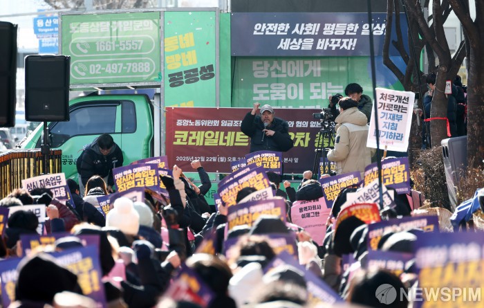 [서울=뉴스핌] 최지환 기자 = 22일 오후 서울 용산구 코레일네트웍스 사무실 앞에서 열린 코레일네트웍스지부 총파업 결의대회에서 참가자들이 구호를 외치고 있다. 2025.12.22 choipix16@newspim.com |